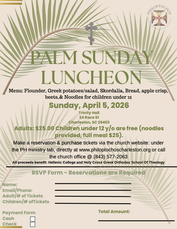 Join us for our Palm Sunday Luncheon on Sunday, April 5, 2026 at Trinity Hall in Charleston, featuring a delicious Lenten menu including flounder, Greek potatoes, salad, skordalia, bread, beets, and apple crisp, with all proceeds benefiting Hellenic College and Holy Cross Greek Orthodox School of Theology.