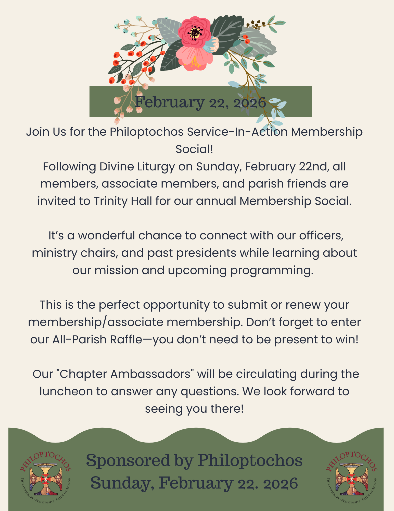 Joanna Catravas February 21, 2026 Announcement, Holy Trinity, Philoptochos Philoptochos Social Feb 22 after Divine Liturgy Joanna Catravas February 21, 2026 Announcement, Holy Trinity, Philoptochos