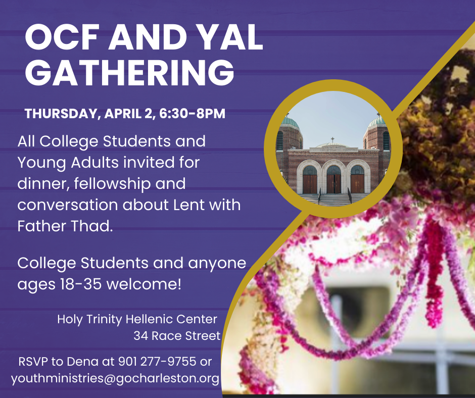 Joanna Catravas March 23, 2026 Announcement, Holy Trinity, YAL, Youth Ministries OCF/YAL Gathering: Thursday, April 2 6:30–8:00 PM Joanna Catravas March 23, 2026 Announcement, Holy Trinity, YAL, Youth Ministries RSVP HERE